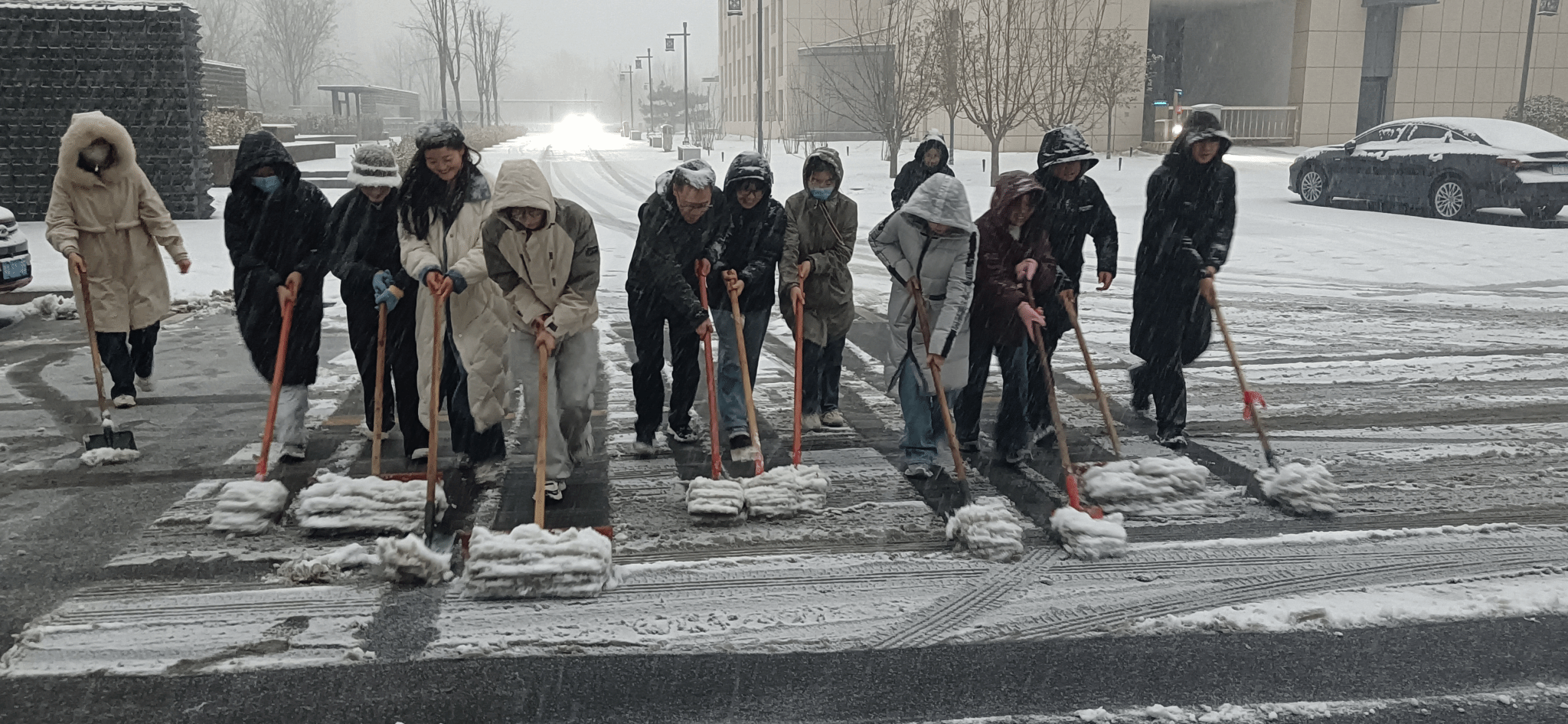 本次扫雪活动重点清理了人流车流较为密集的综合实验大楼南侧机动车道。活动通知一经发布,师生党员踊跃参与,迅速集结。大家手持铁锹等工具,分工协作,有序开展扫雪除冰工作。