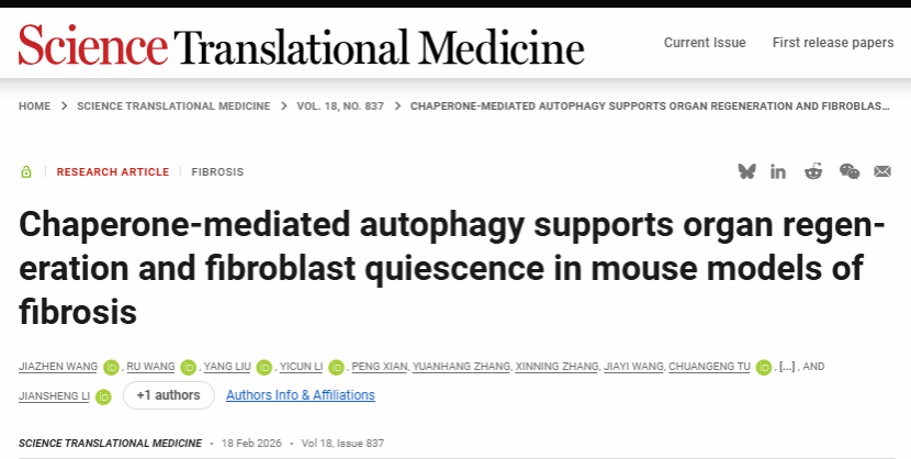 2026年2月18日,我校呼吸疾病中医药防治省部共建协同创新中心李建生教授、王嘉祯研究员在国际权威学术期刊《Science Translational Medicine》(中科院1区Top,IF=15.8)发表重要研究成果。论文以“Chaperone-mediated autophagy supports organ regeneration and fibroblast quiescence in mouse models of fibrosis”为题,系统揭示了分子伴侣介导的自噬(CMA)的关键限速蛋白LAMP2A是多种器官纤维化的共同治疗靶点。研究团队发现,增强LAMP2A介导的CMA通路,能够同时抑制成纤维细胞活化并促进实质器官再生,为纤维化疾病的治疗提供了全新的“双管齐下”策略,也为纤维化研究从“单一靶点”向“多维度干预”的带来了新的研究范式。