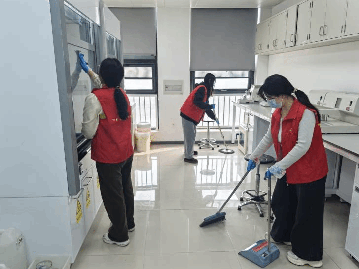 与此同时,志愿服务团同步开展实验室卫生清扫与安全隐患排查行动。志愿者们分工协作、认真细致,对实验室台面、地面、仪器设备、储物区域进行全面清洁整理,清除卫生死角,规整实验耗材与物品摆放。结合实验室安全管理要求,重点排查用电安全、仪器运行、试剂存放、消防设施等关键环节,及时发现并整改潜在安全隐患,切实筑牢实验室安全防线,为全院师生营造干净整洁、规范有序、安全稳定的科研实验环境。
