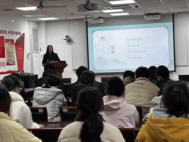 在宿舍安全方面,重点强调防火、防盗、防触电,明确禁止违规使用大功率电器、私拉乱接电线、人走不断电等行为,提醒同学们自觉遵守宿舍管理规定,共建安全文明住宿环境。针对防范电信诈骗,结合近期典型诈骗案例,详细讲解刷单返利、冒充导师亲友、虚假中奖、学术诈骗等常见套路,叮嘱学生提高警惕、守住底线,做到不轻信、不透露、不转账,守护好自身财产安全。网络安全方面,引导学生规范上网、文明发言,自觉抵制网络谣言、不良信息和违法内容,增强网络安全防护意识。意识形态安全方面,教育学生坚定理想信念,严守政治纪律和政治规矩,提升辨别是非能力,树立正确价值观,自觉维护意识形态安全与校园稳定。