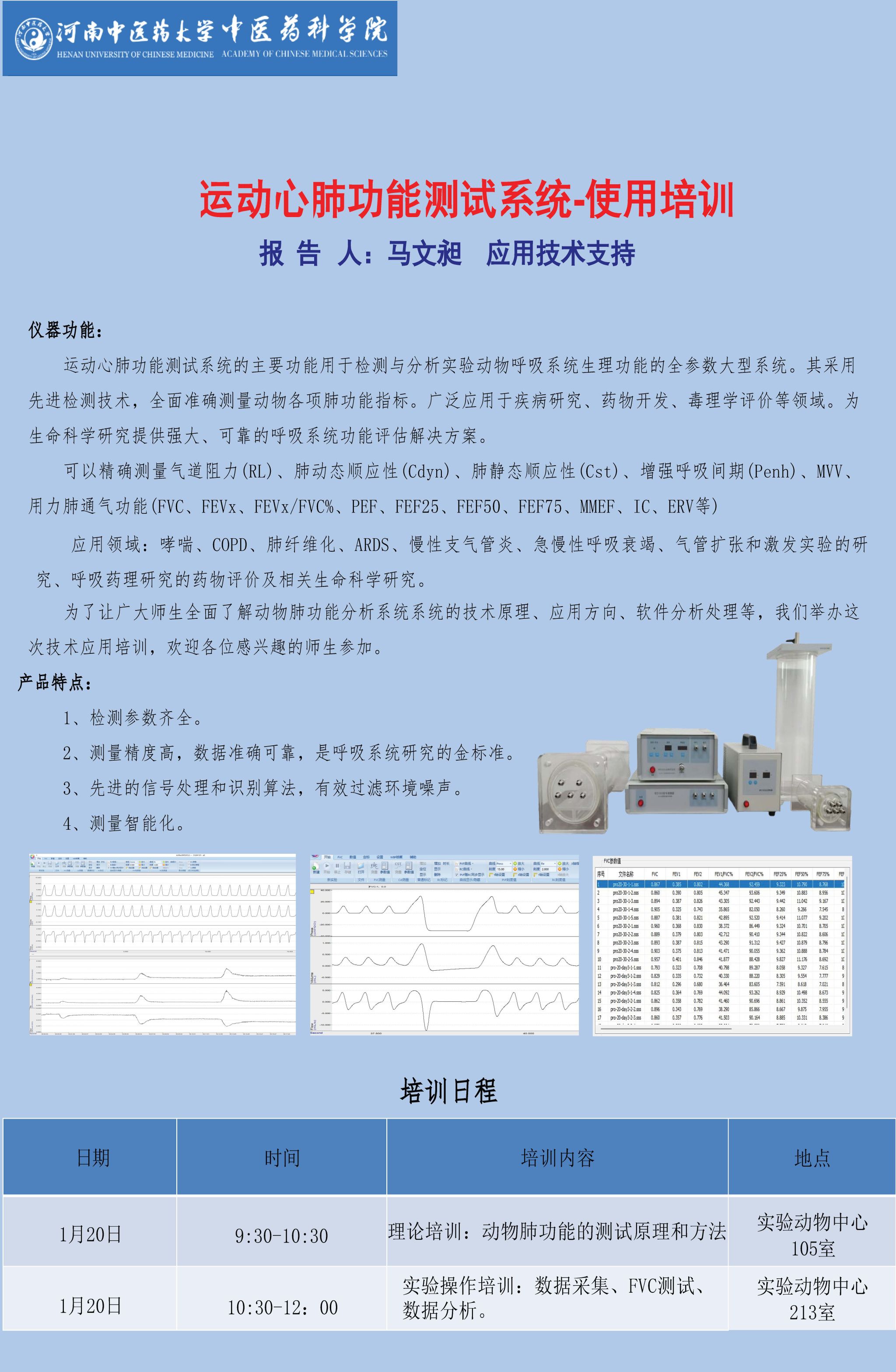 学术交流预告:运动心肺功能测试系统培训交流会 发布时间:2026年01月15日 15:44 河南中医药大学中医药科学院实验动物中心,新购置运动心肺功能测试系统。为此,实验动物中心特邀相关产品技术专家进行技术讲座及交流。会议时间:2026年1月20日,会议地点:河南省郑州市郑东新区金水东路156号实验动物中心。欢迎广大师生参与!