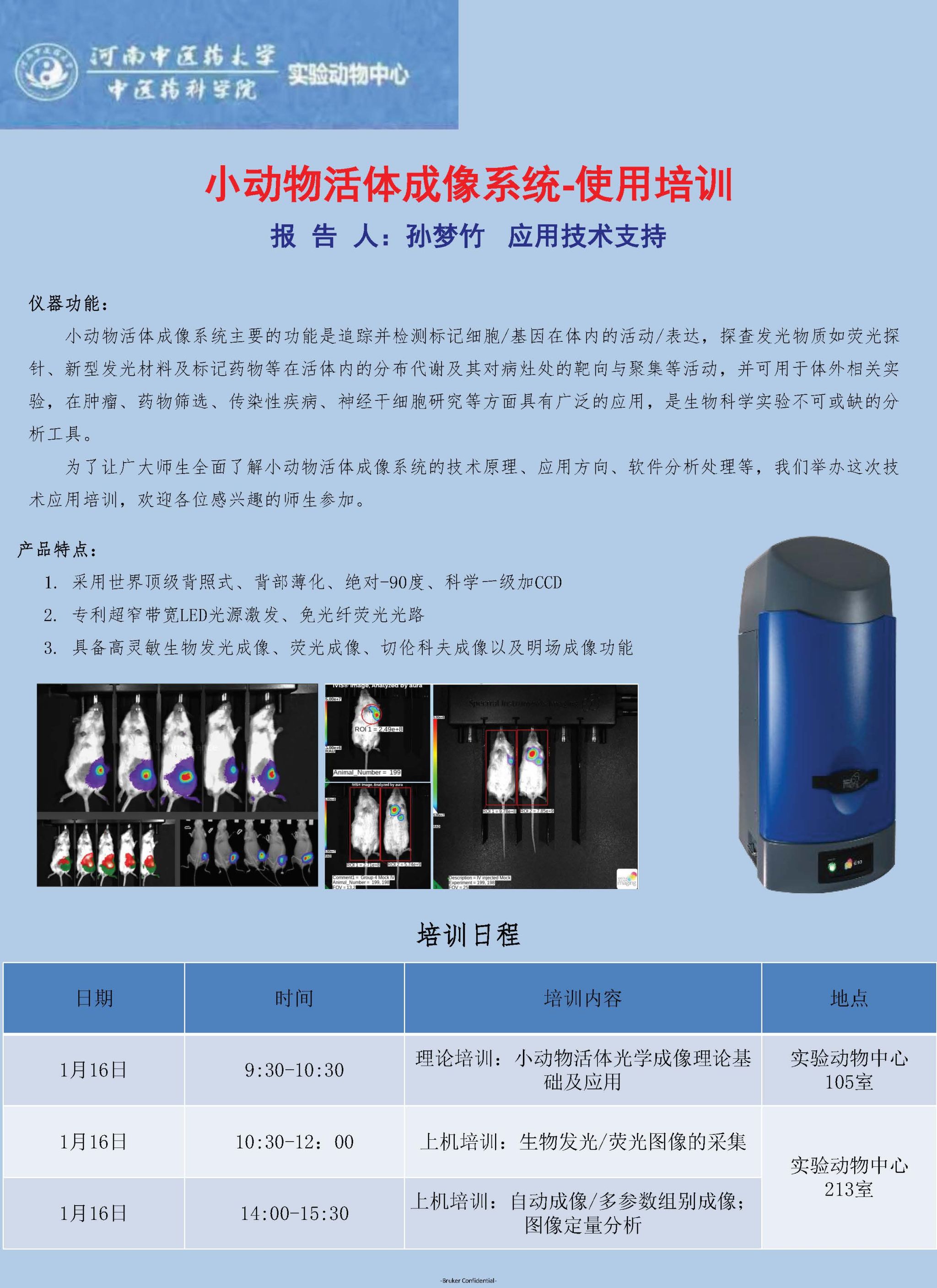 学术交流预告:小动物活体成像系统技术交流会 发布时间:2026年01月12日 15:57 河南中医药大学中医药科学院实验动物中心,新购置小动物活体成像系统。为此,实验动物中心特邀相关产品技术专家进行技术讲座及交流。会议时间:2026年1月16日,会议地点:河南省郑州市郑东新区金水东路156号实验动物中心。欢迎广大师生参与!