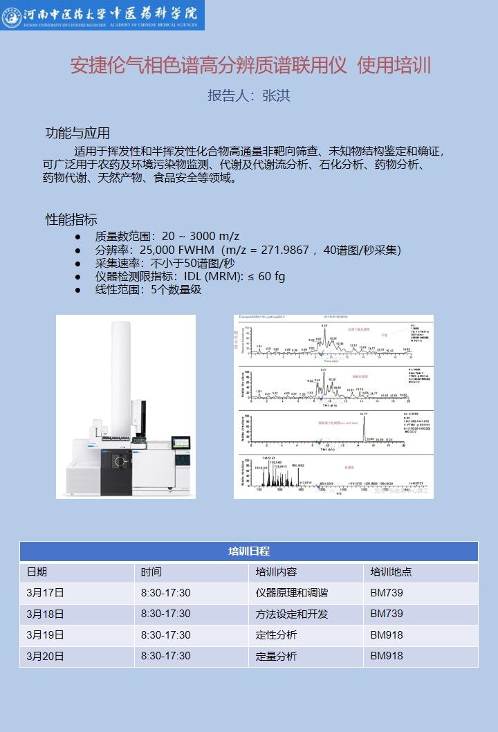 学术交流预告:气相色谱高分辨质谱联用仪培训交流会 发布时间:2026年03月13日 15:53 河南中医药大学中医药科学院,新购置气相色谱高分辨质谱联用仪。为此,特邀相关产品技术专家进行技术讲座及交流。会议时间:2026年3月17-20日,会议地点:河南中医药大学龙子湖校区综合实验教学楼BM739/BM918。欢迎广大师生参与!